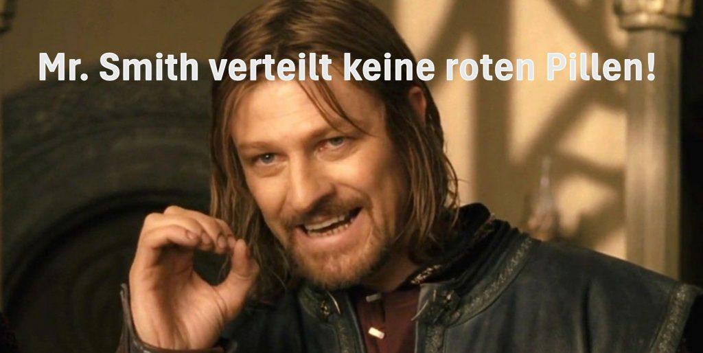 Influencer gaukeln Dir Interesse vor, aber sie kennen Dich nicht. Du bist nicht mehr als der Code, der ihnen angezeigt wird, den sie manipulieren, damit sie Geld bekommen und ihr Bedürfnis nach „Bewundert werden“ befriedigen. Und mit jeder Stunde, die Du am Handy verbringst, verstreicht Dein Leben ereignislos, schwimmst Du in Deiner Blase rum. Du lässt Dir Deine Energie von der Matrix absaugen. Influencer haben kein Interesse daran, dass Du Freunde triffst oder einem Hobby nachgehst. Sie haben kein Interesse daran, dass Du die reale Welt erforschst. Sie haben kein Interesse daran, dass Dein Leben so toll wird, dass Du das Handy für immer weglegst. Mr. Smith hat nur einen Auftrag: Dich in der Matrix zu halten. Dir die blaue Pille zu geben.